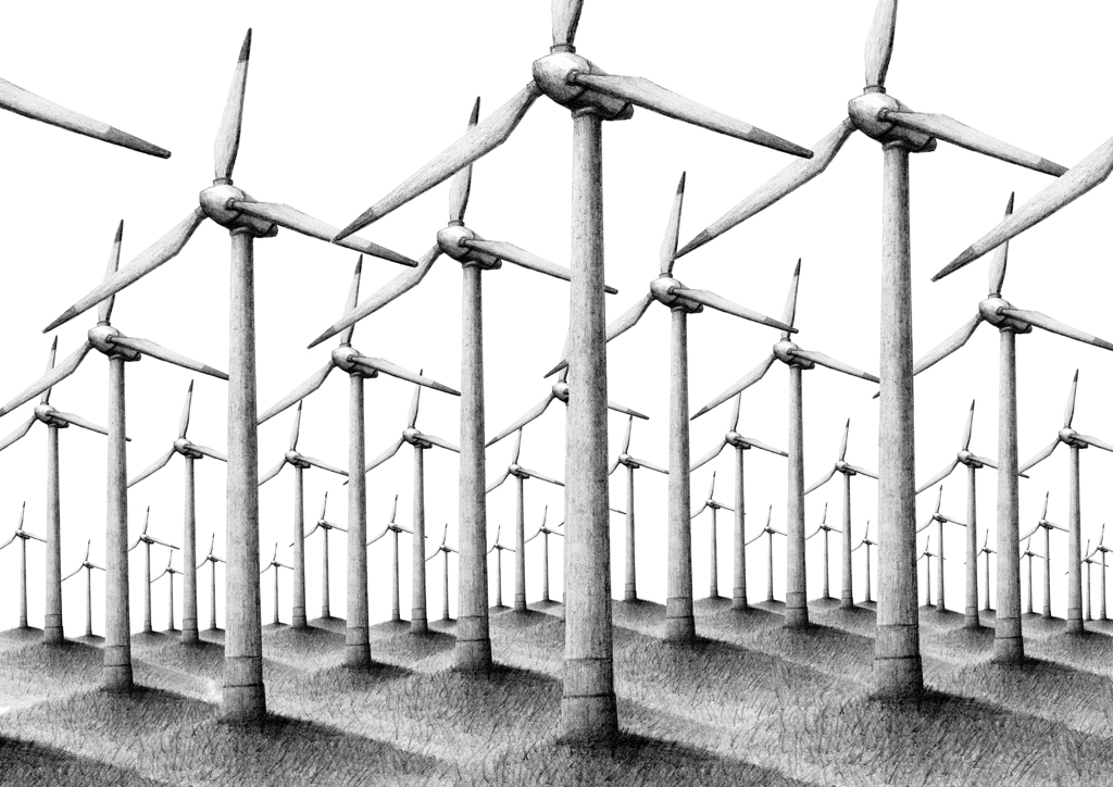 Windräder, Bleistift auf Papier, digitale Collage, © David Kröswang
